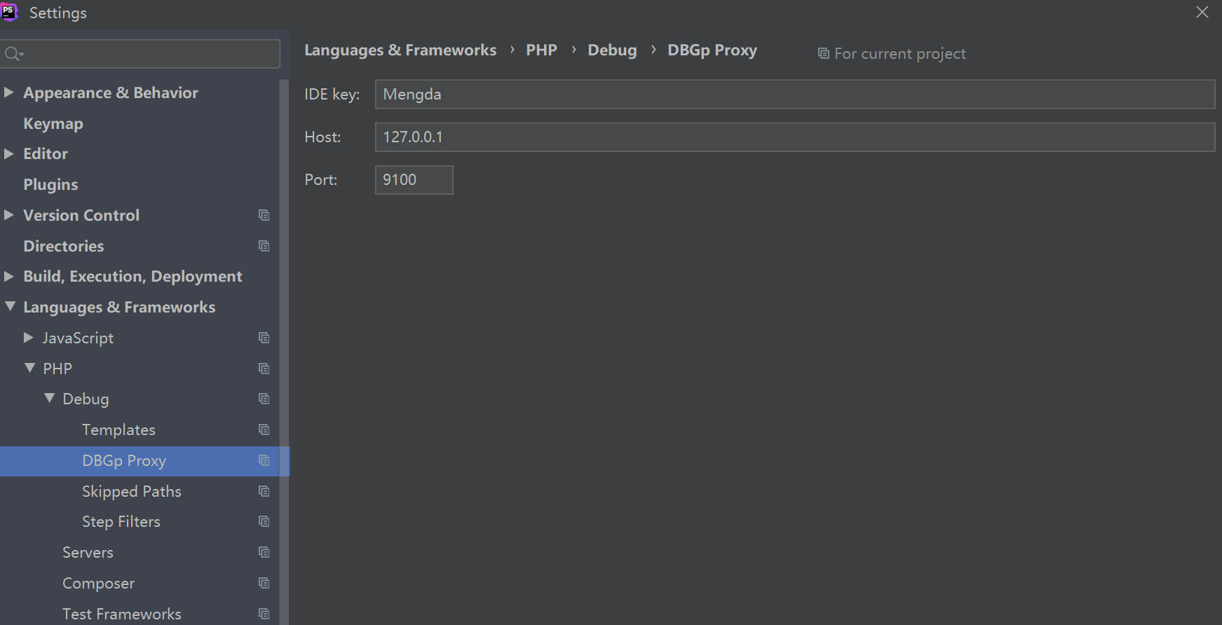 看到对应的setting->php->Debug->DBGP Proxy更改对应的IDEKEY(配置文件中设置的Key),HOST,Port