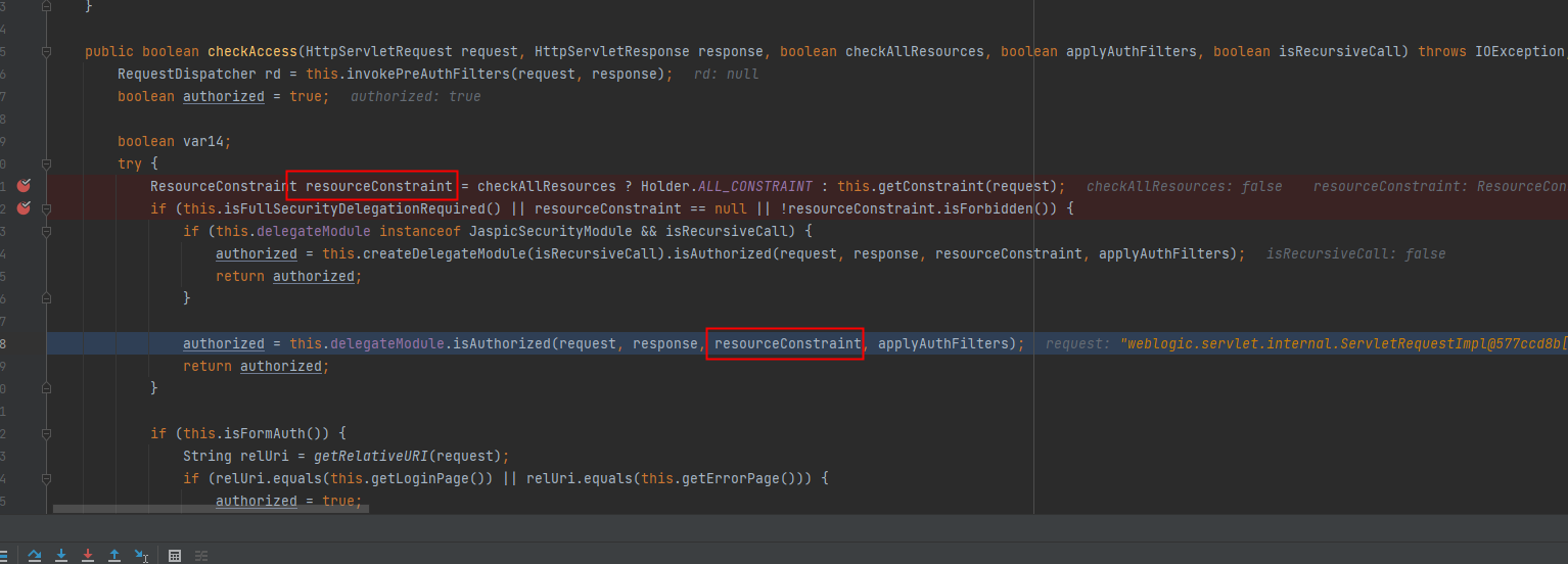 在此处下断点,此处代码是在WebAppServletContext#doSecuredExecute方法中的,checkAccess方法中就判定了该次请求路由是否是有权限访问的